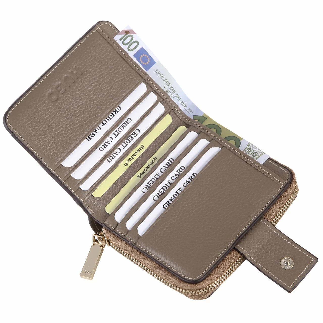 - Außenseite vorne: Zweigeteiltes Münzfach mit Reißverschluss