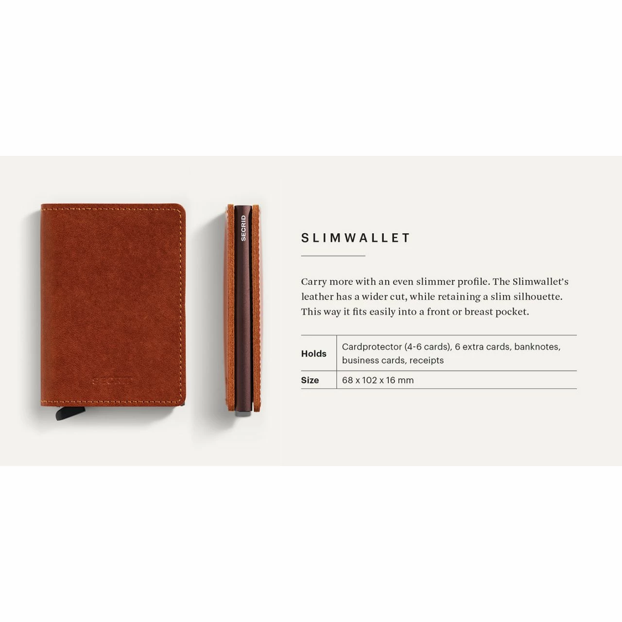 Das Slimwallet ist für alle geeignet, die gerne ohne Münzgeld auskommen. Umhüllt von qualitativ hochwertigem Leder bietet das Slimwallet bis zu 6 Karten Platz. Auch Geldscheine, Visitenkarten oder Kassenbelege finden hier Ihren Platz. Dank der geringen Größe und der extra schmalen Optik passt das Slimwallet auch in die Brusttasche des Jackets oder Hemds.