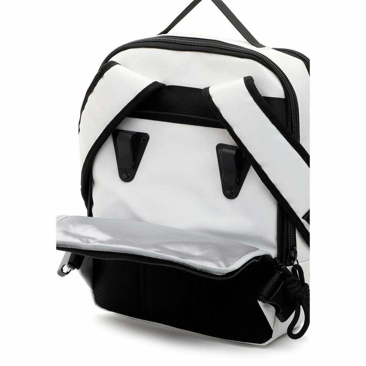 - Unter dem Rückenteil verbirgt sich eine Aufhängung, um den Rucksack an einem Fahrradgepäckträger zu befestigen