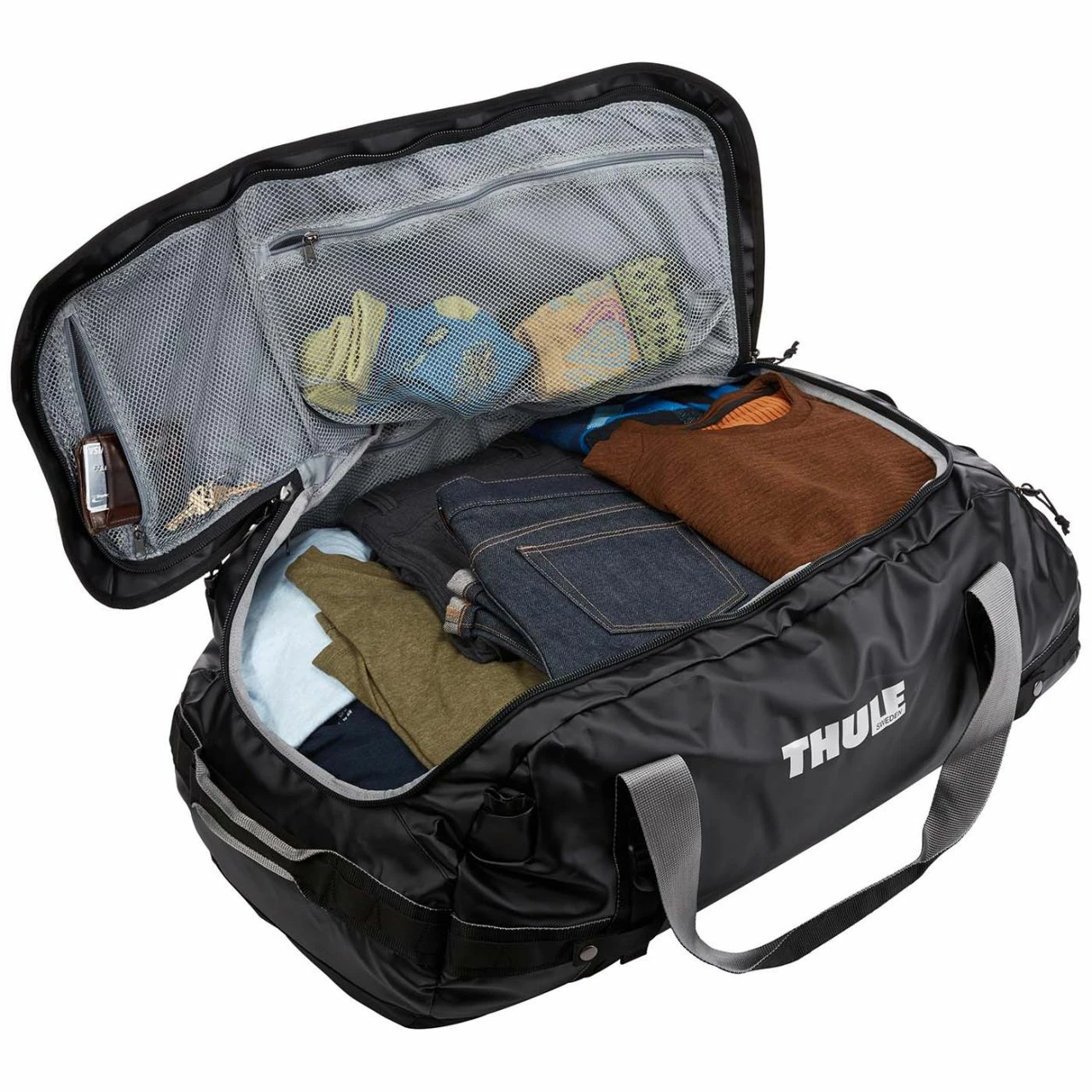 Reisetasche Thule Duffelbag 130L mit abnehmbaren Rucksackgurten und extrabreiter Öffnung. Die Reisetasche kann zudem als Rucksack getragen werden. Dabei lassen sich alle Gurte im Nichtgebrauch problemlos verstauen. Der Thule Duffelbag 130L verfügt über innere Netztaschen und äußere Kompressionsriemen, sodass der Inhalt nicht in der Tasche nach unten rutscht. Zudem verfügt die Reisetasche über einen gepolsterten Boden und kleinere, äußere Reißverschlusstaschen.